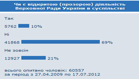 На запитання: "Чи є відкритою (прозорою) діяльність Верховної Ради України в суспільстві" ствердно відповіли всього 10% (5 тис. 762 респондентів).