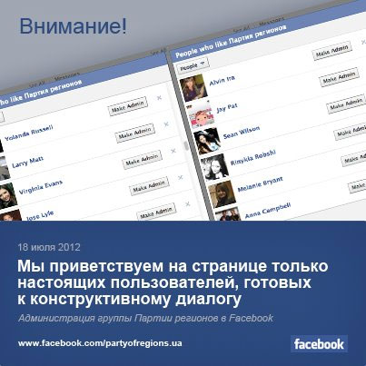 "За сьогоднішню ніч кількість користувачів, що приєдналися до сторінки Партії регіонів, збільшилася більш, ніж на тисячу (у вівторок, 17 липня, таких користувачів було близько 300, на ранок 18 липня ця кількість зросла до 1630). Перевірка користувачів, які приєдналися за ніч, показала, що в основному це профілі з ознаками ботів (іноземні імена, маленька кількість друзів, відсутність фотографій та активності)", - сказано у ньому.