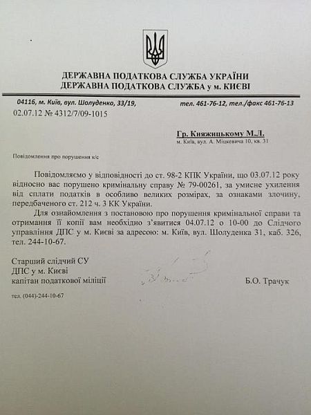Слідчий податкової повідомив гендиректору ТВі Миколі Княжицькому про порушення проти нього кримінальної справи 3 липня листом від 2 липня.