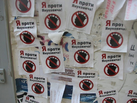 У п’ятницю всю центральну частину Львова заклеїли наклейками з написом "Я проти Януковича" та перекресленим силуетом чоловіка з короною на голові.