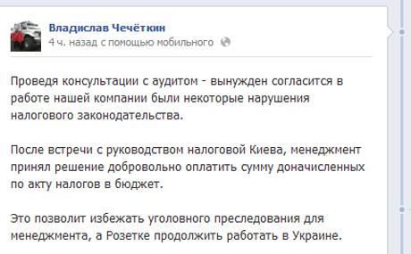 "Провівши консультації з аудитом – змушений погодиться: у роботі нашої компанії були деякі порушення податкового законодавства. Після зустрічі з керівництвом податкової Києва, менеджмент прийняв рышення добровільно оплатити суму донарахованих по акту податків у бюджет", - написав він.
