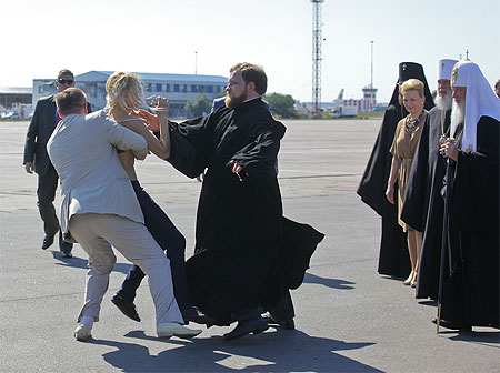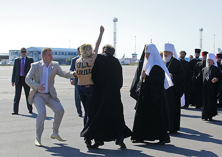 Напівгола активістка жіночого руху Femen кинулася назустріч патріарху Московському і всієї Русі Кирилу під час його прибуття в міжнародний аеропорт "Бориспіль".
