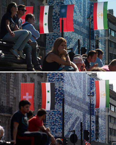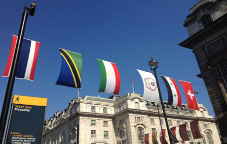 Червоно-синій прапор Тайваню провисів на Ріджент-стріт кілька тижнів в числі 206 прапорів інших олімпійських націй.