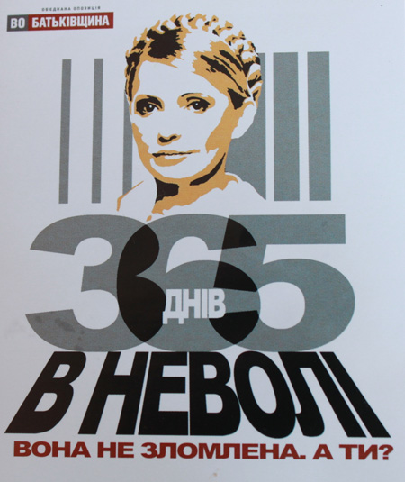 Також цього дня в усіх районах Києва з’явилися стікери з зображенням Тимошенко "365 днів в неволі. Вона не зломлена, а ти?".