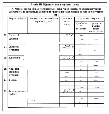 Ірина Луценко володіє земельною ділянкою загальною площею в 775 кв. м., житловим будинком – у 203,9 кв. м, квартирою – у 186,9 кв. м, іншим нерухомим майном у 316,8 кв. м.