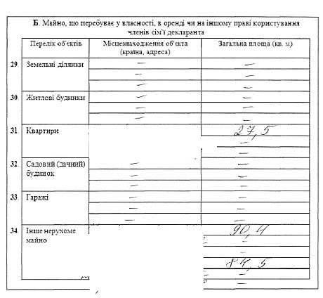 Члени її родини володіють квартирою загальною площею 27,5 кв. м, а також іншим нерухомим майном площею 90,4 кв. м та 84,5 кв. м.