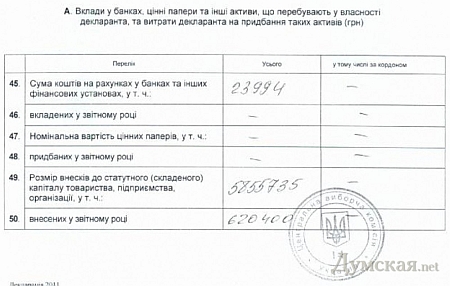 На рахунку в банку у Маркова всього 24 тисяч гривень. У статутні фонди підприємств він вніс 5 мільйонів 855 тисяч гривень.