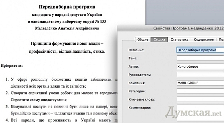 На сайті ЦВК, крім майнових декларацій кандидатів, розміщені їх передвиборчі програми. Документи можна завантажити в doc-форматі. Комп'ютерна програма має опцію "властивості документа" графу "автор", яка найчастіше заповнюється за умовчанням. "Ворд" копіює туди ім'я, вказане при установці редактора.