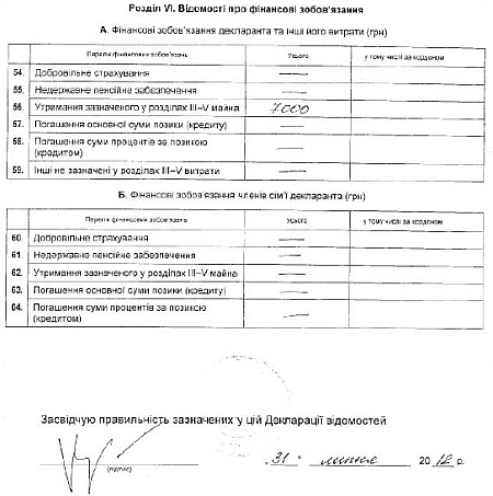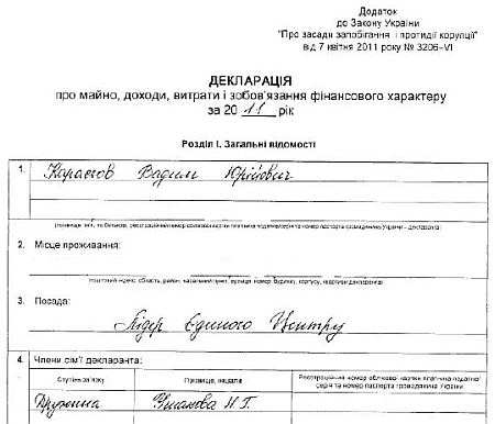 Згідно документу в минулому році Карасьов отримував лише зарплату. Його ж дружина за рік заробила 101,86 тисячу гривень, теж у вигляді ЗП.