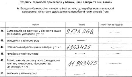 На рахунках у Порошенка-старшого 9 мільйонів 528 тисяч 268 гривень. Цінних паперів він має на 1 903 425 гривень.