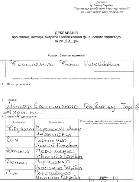 З декларацією Петра Порошенка, який також балотується по одному з мажоритарних округів Вінниччини, можна ознайомитись тут. У 2011 році він заробив 86,6 мільйонів гривень, як дивіденди, проценти, роялті. Зарплатні у звітному році він не отримував.