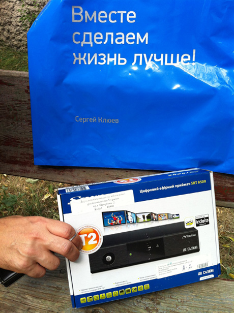 "Згідно з постановою Кабміну, моя матір підпадає під категорію тих, хто може безкоштовно одержати тюнери для цифрового телебачення від держави. Вона написала заяву в місцеве управління праці й соціального захисту населення. Через якийсь час нам прийшло повідомлення, що на пошті нас чекає посилка на її ім'я. На пошті ми одержали тюнер у пакеті з підписом Сергія Клюєва", - розповів Гетьман.