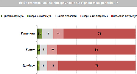 Мешканці Заходу, Центру, Півночі та Сходу країни не підтримують відокремлення жодних територій, але в Криму є певна підтримка відокремлення своє території від України, так само як і на Донбасі своєї.