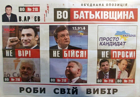 В "Ударі" вказують на розповсюдження у 218 виборчому окрузі столиці газети кандидата від об’єднаної опозиції Володимира Ар’єва, на першій шпальті якої розміщено фотографію Віталія Кличка та кандидата від партії "Удар" по округу Олександра Сергієнка з написом "Не вір!".
