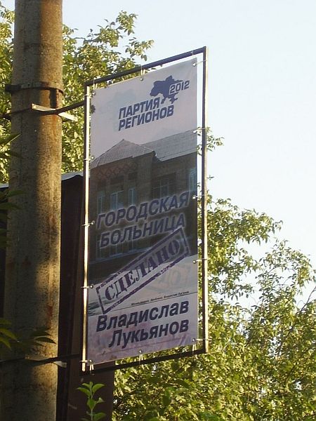 Кандидат в депутати від Партії регіонів Владислав Лук'янов розмістив у місті Харцизьк Донецької області плакати зі своїм прізвищем та інформацією про ремонт доріг та лікарні.