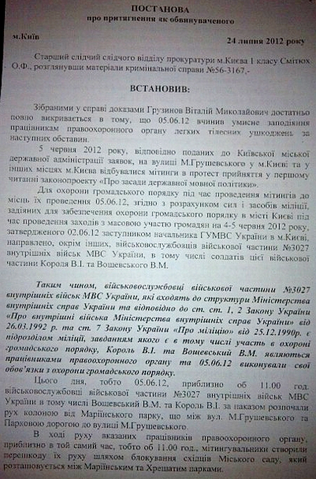 У постанові про притягнення Грузінова як обвинуваченого сказано, що під час мітингу протесту проти мовного закону, він завдав легких тілесних ушкоджень солдатам міліції Королю та Вощевському.