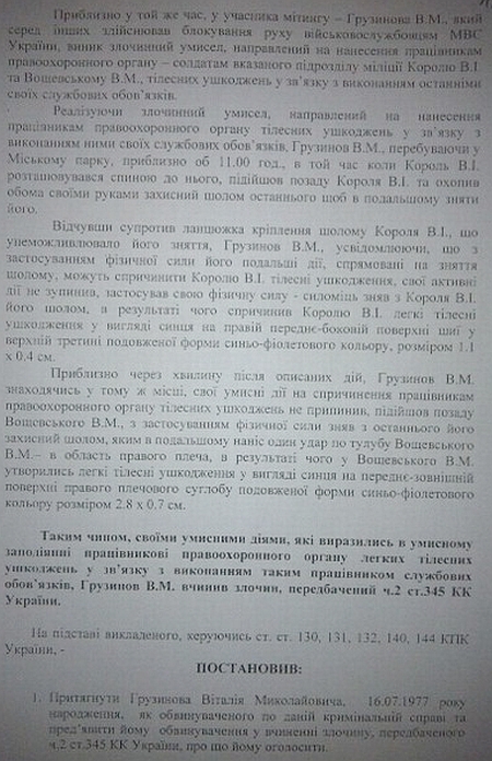 "За хвилину Грузінов також зірвав шолом бійця Вощевського, після чого вдарив міліціонера цим шоломом у праве плече, від чого на останньому утворився синець "подовженої форми синьо-фіолетового кольору розміром 2,8 Х 0,7 см", - йдеться у постанові.