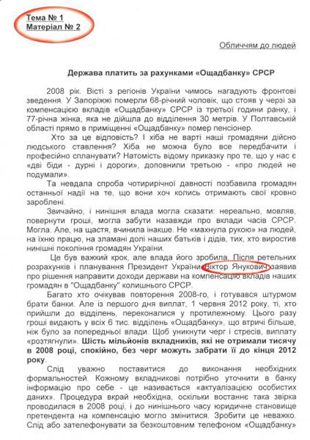 "Ми хочемо, щоб люди дізналися про виплату тисячі Ощадбанком, про доступне житло. Власне такі будуть матеріали — Ощадбанк, пенсія, доступне житло. Партію регіонів жодного разу не згадають. У тексті повинно бути лише слово "президент"… Це — проект під наступні президентські вибори", – пояснив Мазур.