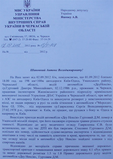 За інформацією МВС, Мерседесом керував Сергій Гавриленко. "Відповідно до акту медичного огляду Гавриленка встановлено, що під час ДТП він був тверезим", - сказано у відповіді.