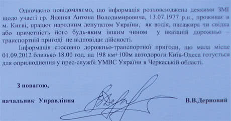 В документі вкотре наголошується, що сам Яценко не був присутній ні як водій, ні як свідок і не причетний до аварії "будь-яким іншим чином".