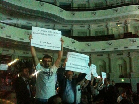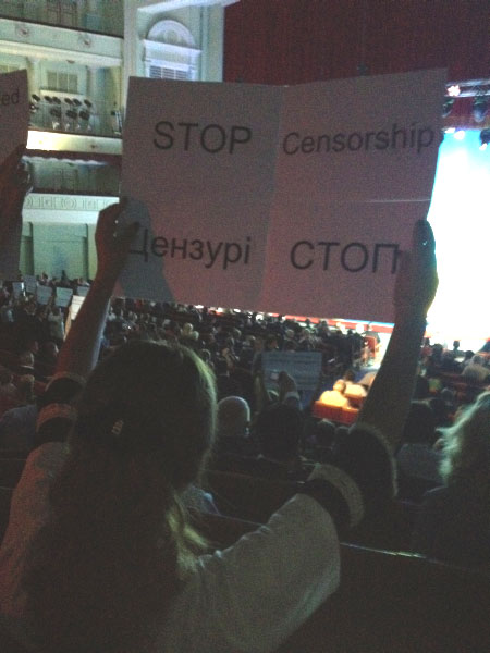 Як відомо, під час виступу президента Віктора Януковича на Всесвітньому газетному форумі, представники "Стоп Цензурі!" підняли плакати з висловами про цензуру в Україні та відсутність демократії.