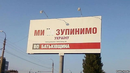 На білбордах "Батьківщини" з написом "Ми їх зупинимо. За Україну" слова "їх" та "за" було заклеєно білим папером. Внаслідок цього утворився новотвір: "Ми зупинимо Україну".