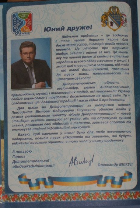 Школярам Дніпропетровська "порекомендували" щоденник, у якому розміщені фотографія та звернення голови Дніпропетровської облдержадміністрації Олександра Вілкула.