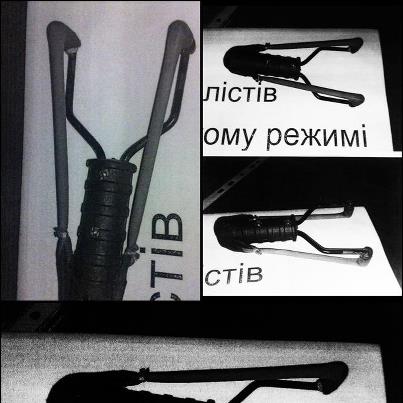 При цьому він не зміг пояснити зв'язок між плакатами журналістів та рогатками, заявивши, що він не знає, комі належать ножі, рогатки та спиртне, і чи було це все вилучено у журналістів.