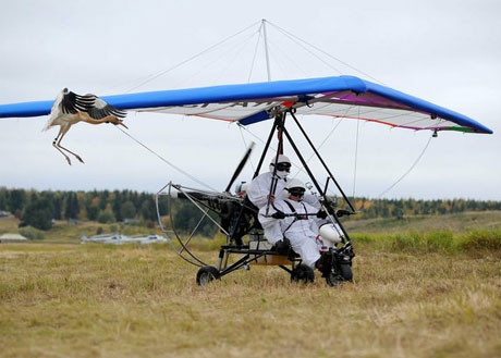 Другий політ з журавлями пройшов успішно - в хвіст дельтаплану прилаштувалися п'ять птахів і, хоча через кілька кіл залишилося тільки двоє, вони летіли ще хвилин 15, впевнено тримаючись і ловлячи повітряні потоки.
