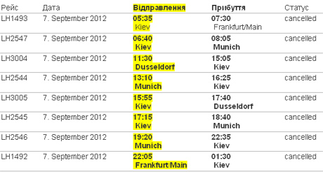Так, скасовано вісім рейсів до Києва з Дюссельдорфа, Мюнхена та Франкфурта на Майні та в зворотньому напрямку, які мали курсувати 7 вересня, у п'ятницю.
