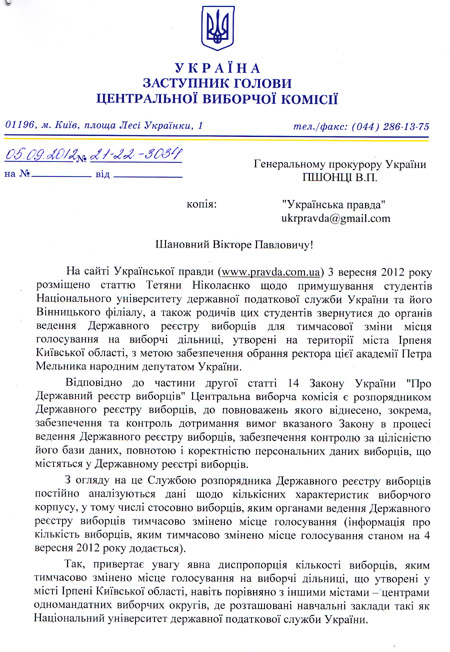 ЦВК просить Генерального прокурора Віктора Пшонку перевірити факти примушування студентів Національного університету державної податкової служби голосувати за Петра Мельника.