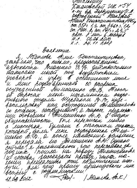 Абаплова підтвердила, що "лист, наданий адвокатом Власенко С.В., дійсно написаний мною під впливом умовлянь і погроз щодо мене та моїх родичів з боку засудженої Тимошенко Ю.В.".