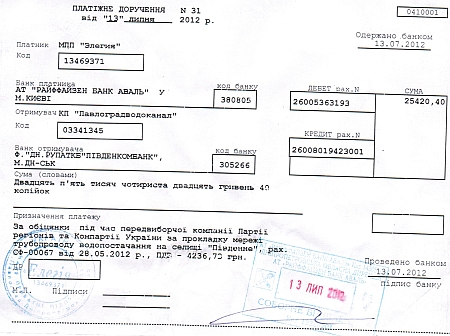 Зокрема, в платіжному дорученні №31 від 13 липня 2012 року платник, яким є МПП "Елегія", призначення платежу - за обіцянки під час виборчої кампанії Партії регіонів та Компартії за прокладку трубопровідної мережі водопостачання в селищі "Південне" (рахунок СФ-00067 від 28.05.2012 року).