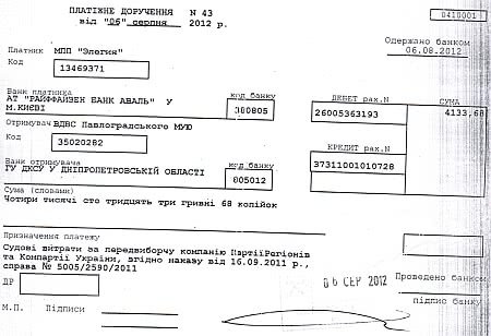 У платіжному дорученні №43 від 6 серпня 2012 року у призначенні платежу зазначено: "Судові витрати за передвиборчу кампанію Партії регіонів та Компартії згідно з наказом від 16.09.2012 року, справа №5005/2590/2011".