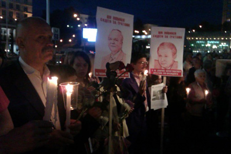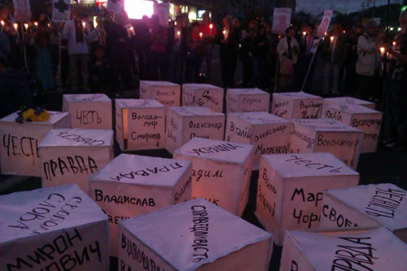 Як передає "Інтерфакс-Україна", кількасот учасників акції створили символічний круг, по центру якого були розкладені картонні коробки з написаними іменами загиблих журналістів.