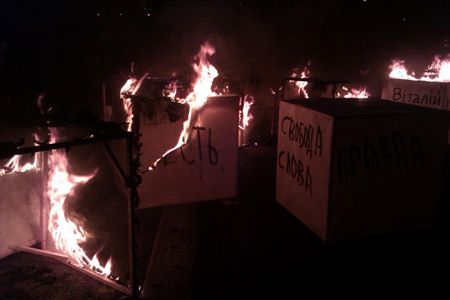 Рівно о 20:00 люди хвилиною мовчання внашували пам'ять загиблих журналістів, після чого запалили свічки і поставили їх в символічне згарище свободи слова. Коробки з іменами загиблих журналістів були спалені.