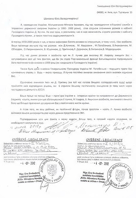 Турчинов розповів, що на початку цього року Мельниченко вийшов на зв'язок з родиною Тимошенко та передав їм листа, у якому зазначив, що Кучма дав вказівку Миколі Азарову "знищити" її.