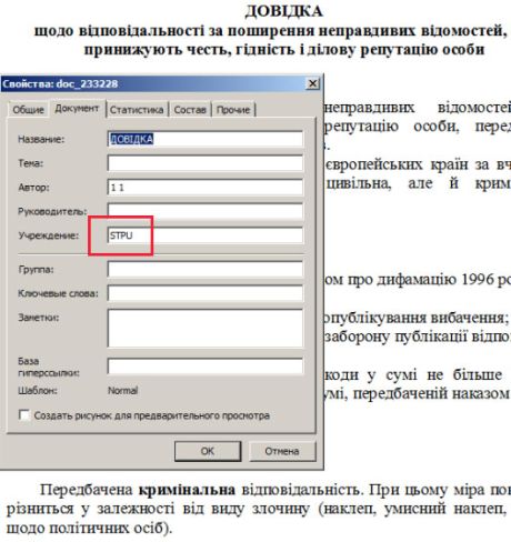 Такі "властивості файлу" стоять на комп'ютерах Адміністрації президента, що дає підстави стверджувати, що супровід законопроекту щодо наклепу здійснювалося Адміністрацією президента Віктора Януковича.