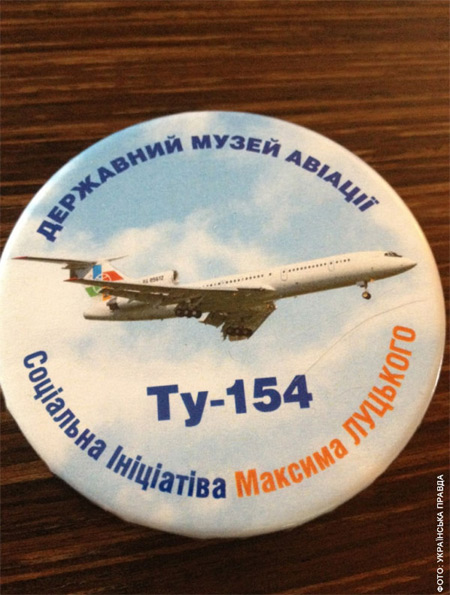 Напис на значку повідомляв: "Державний музей авіації соціальна ініціатива Максима Луцького". При цьому слово "ініціатива" на значку написане з помилкою, через "і" як "ініціатіва".