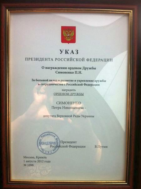 Лідер Компартії України Петро Симоненко нагороджений російським орденом Дружби.