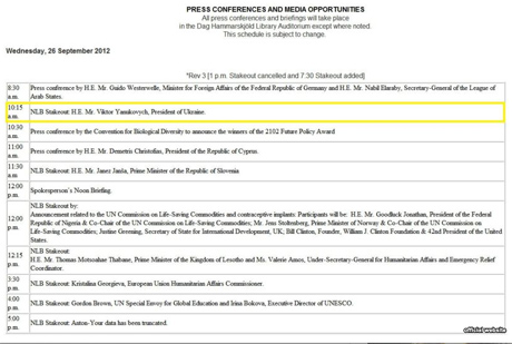 На підтвердження цієї інформації прес-офіс секретаріату ООН надіслав свій розклад прес-конференцій та брифінгів на 26 вересня, згідно з яким президент Віктор Янукович мав виступати о 10:15 місцевого часу.
