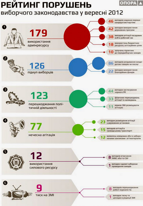 Не менш поширеним явищем є і порушення порядку проведення агітації (77 разів у 18 областях, найбільше – в Одеській і Луганській), використання силового ресурсу (12 разів у 6 регіонах, серед яких лідерів – Луганська та Рівненська області) та тиск на ЗМІ (9 випадків).