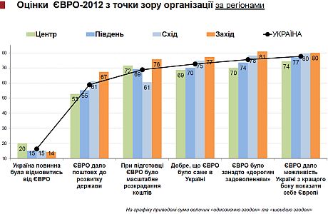 Майже 60% опитаних вважають, що проведення Євро-2012 в Україні дало поштовх до розвитку держави, не згодні – чверть. Ця думка більш популярна серед прихильників Партії регіонів та "невизначених". На заході цю тезу поділяють більше, ніж на сході і півдні.