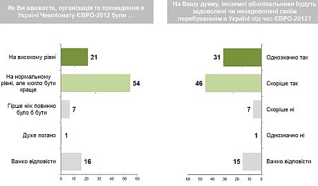 21% опитаних вважають, що організація та проведення в Україні чемпіонату з футболу Євро-2012 пройшли на високому рівні, ще 54% - на нормальному рівні, хоча могло бути і краще. Лише 8% опитаних оцінили організацію та проведення Євро в країні на низькому рівні.