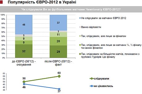 Згідно з дослідженням "Рейтингу", проведеним напередодні "Євро-2012" у травні, слідкувати за матчами чемпіонату збиралися майже половина українців, що вже було більше, ніж увага до Мундіаль-2010, який зацікавив менше 40% українців.