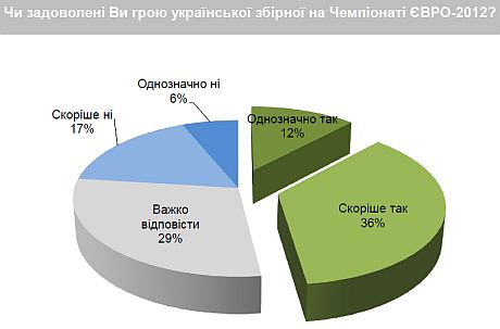 Майже половина - 48% - задоволені грою української збірної на "Євро-2012", хоча однозначно задоволених виявилося лише 12%. Серед активних уболівальників задоволені грою збірної дві третини, однозначно задоволені – чверть.