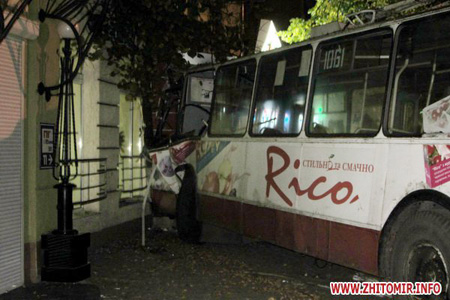 Як повідомляє Житомир.info, в п'ятницю близько півночі тролейбус маршруту № 3 "Богунія-Вокзал-Смолянка" в'їхав в будівлю UniCredit Bank на вул.Київська, 64.