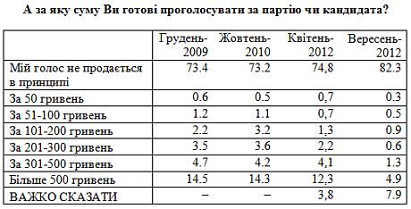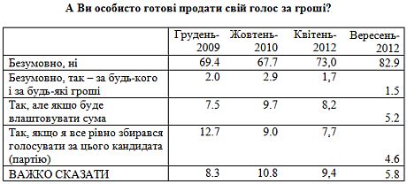 Тепер 1,5% готові продати свій голос за будь-яку суму, 5,2% – якщо сума влаштовуватиме, 4,6% – якщо заплатить той кандидат чи партія, за яку у будь-якому разі збиралися голосувати.