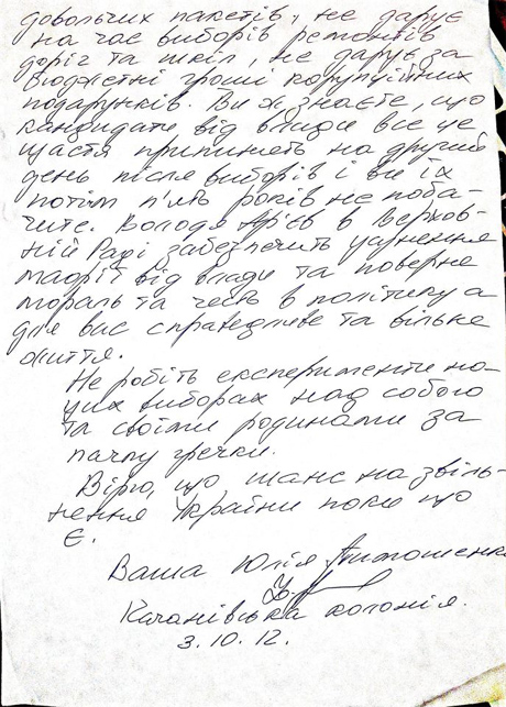 "Він не роздає продовольчих пакетів, не дарує на час виборів ремонтів доріг та шкіл, не дарує за бюджетні гроші корупційних подарунків. Ви ж знаєте, що кандидати від влади все це щастя припинять на другий день після виборів і ви їх потім п’ять років не побачите", - йдеться у листі.