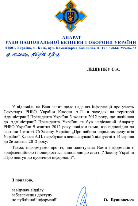 Апарат Радбезу вважає конфіденційною інформацію про зустрічі, які секретар РНБОУ Андрій Клюєв проводив у адміністрації президента під час офіційної відпустки.